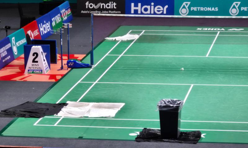 Aksi pusingan pertama Badminton Terbuka Malaysia itu terpaksa dihentikan buat sementara waktu susulan kebocoran itu.